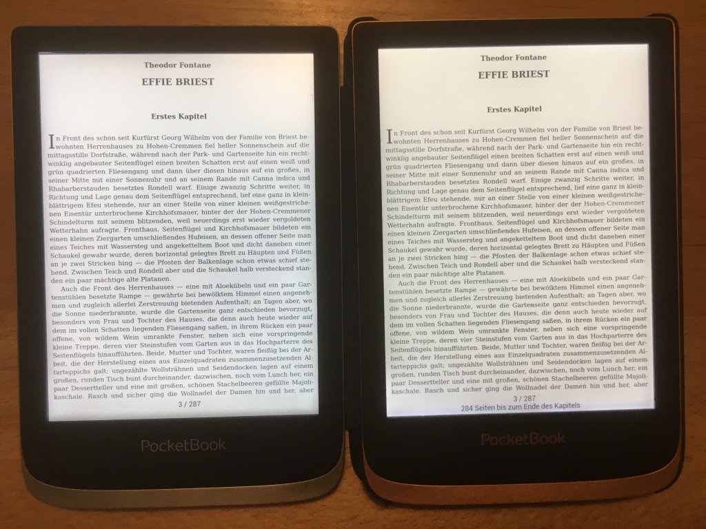 They show a comparison between the new Pocketbook Color and last years Pocketbook Touch HD 3 in various lighting conditions. The display of the PB Color looks noticable darker. In the last, close-up picture you can see, that the background does not turn completely "white". (Small, grey dots remain.) Maybe this just a software issue? 1. picture: Outside, no backlight. 2. picture: Outside, 100% backlight. 3. picture: Inside, 100% backlight. 4. picture: Close-up image of both screens. (Color left, HD3 right) |