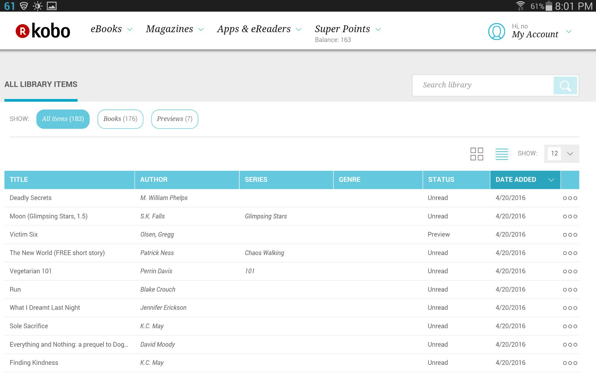 Also, for anyone who hasn't seen it, there's an issue with some books missing now that Kobo has updated the library. Mostly Sony to Kobo transfers. You can read more about it in the Kobo forum