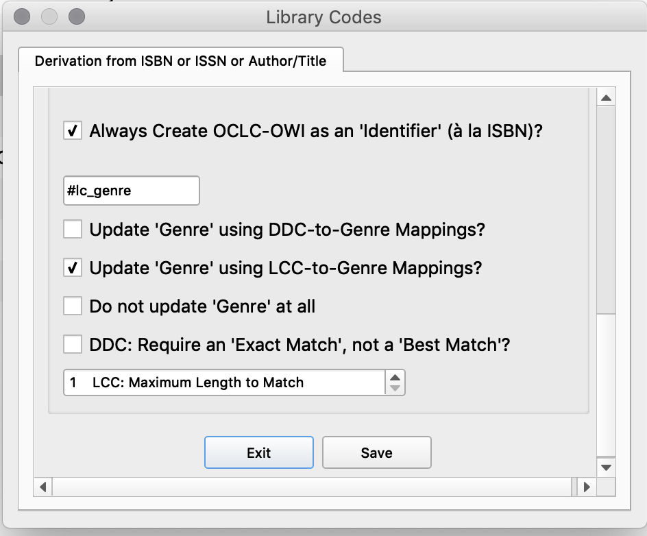 The first time, it insisted that I create the extra author info field (apparently, unchecking it doesn't stick), so I went back to the config and clicked the button to create the field and ran the plugin again. I re-ran the plugin (how that I have both DDC and LCC entries) again. No genre information was collected, regardless of whether I had LCC-to-Genre mapping or DDC-to-genre mapping selected. Am I doing something wrong? |