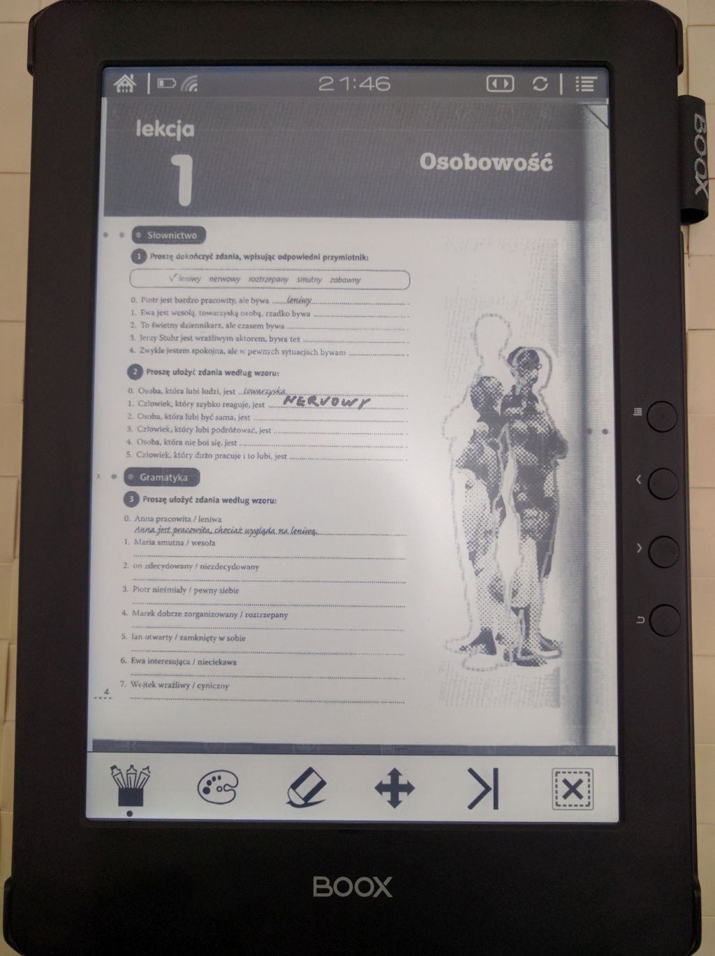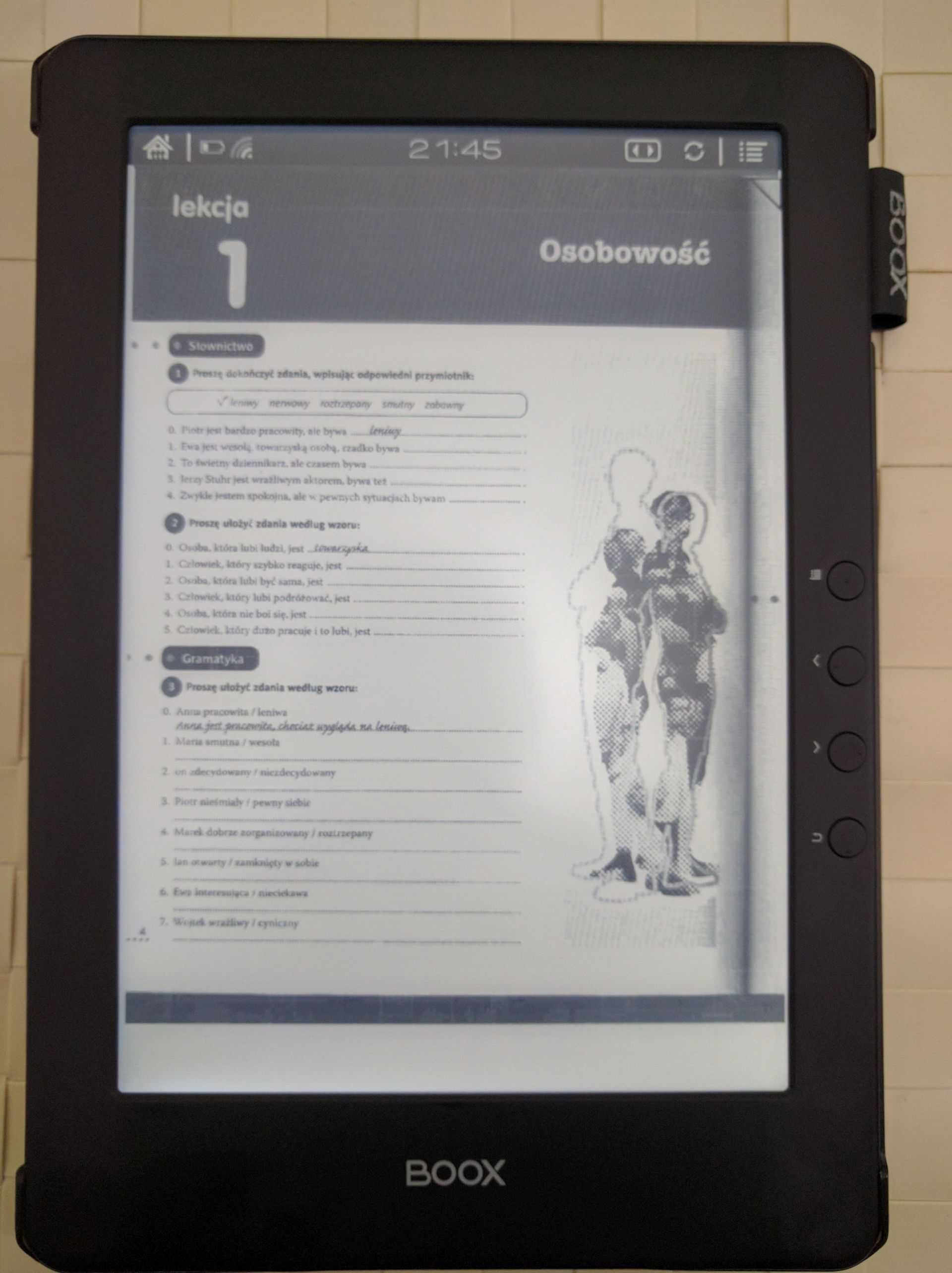 I have been reading this forum for a half a year, but has not left a single post yet. I was waiting for any video review of Onyx N96ML and noone has uploaded it. I am a female student and now I am taking course in Polish language. I have digital copies of textbooks(only three) and need to know whether this device can cope with them. Could you tell me please, who already has this model, will I be able to write in words on every page, and then save it and send it to my lecturer. ![]() Textbook's page attached: |