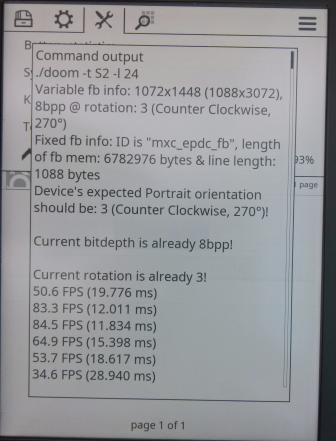 - Commande : ./doom -t S2 -l 24 - On "Kobo Clara HD" function without problems. Animation is fluid. Here is the Result: - Full result detail is here : Spoiler: