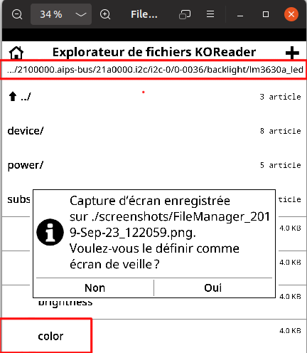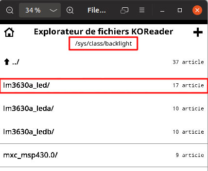 (I set "ftrontlight" before starting the Koreader to 100% before starting the command line). - Yes. "Color" file is in folder "lm3630a_led" (When I look through the file manager "koreader", so I see "Color in folder lm3630a_led", but through the file manager through Linux I see the frontlight as an empty folder.) I just noticed that when I click on the "backlight" folder so it redirection me to another folder, is it normal? -Here I am at the "backlight" folder level: Spoiler: