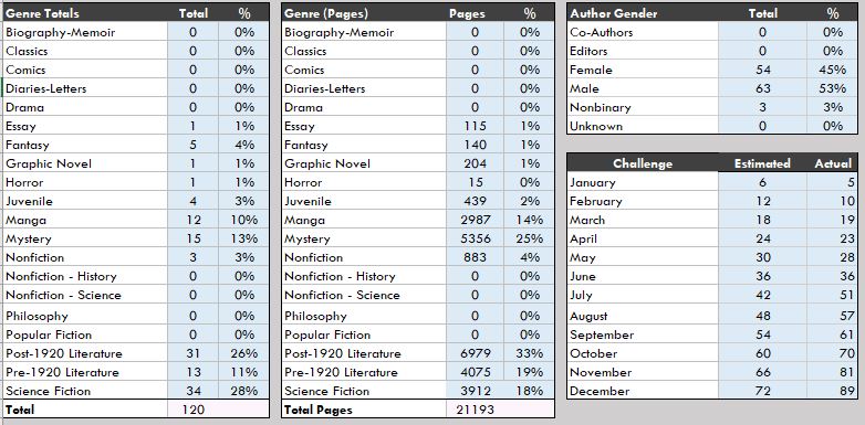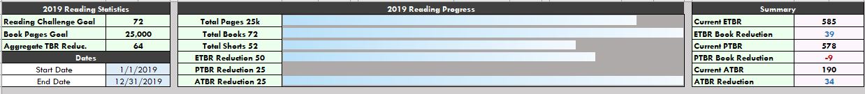Length Goals: Total Books: 50 (stretch goal of 75) | Total Pages: 25,000 | ETBR Reduction: 25 | PTBR Reduction: 10 Substantive Goals: Read at least 51% non-American authors | Read more female/nonbinary authors than male | Read at least 52 short stories | Read at least 10 of the New Leaf Book Club/Literary Book Club selections 2019 Totals: 89 books - 178% of my goal - GOAL MET 38 short stories - 73% of my goal - GOAL NOT MET 21,193 - 85% of my goal - GOAL NOT MET 48% female/nonbinary authors / 52% male authors - GOAL NOT MET 43% US authors / 57% non-US authors - GOAL MET ETBR Reduction: Reduced by 39 - 156% of my goal - GOAL MET PTBR Reduction: Reduced by -9 - -90% of my goal - GOAL NOT MET Read at least 10 of the New Leaf Book Club/Literary Book Club selections - GOAL MET (Geeky spreadsheet snaps attached) |