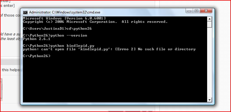 cd \python26 [press enter] python --version [press enter] python kindlepid.py[press enter] Show me a print screen of those commands and their results. BOb |