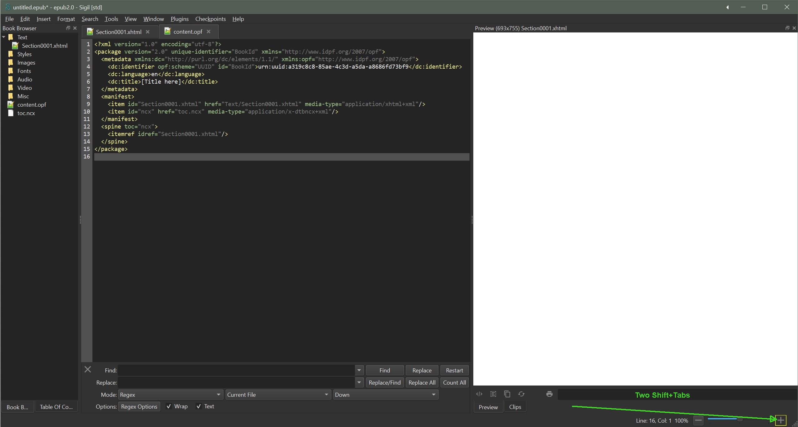 Update: checked the code and Next Tab and Previous Tab are both registered with the Shortcut Manager so you control those shortcuts. As for Shift Tab or BackTab that should go back to the previous place you tabbed away from. The QTabBars do now allow focus by tab so that tabs inside Sigil Preferences can now be accessed from by Tab shifting focus as previously there was no easy keyboard way to change tabs. Using the arrow keys on a QTabBar should allow you to change to another tab. Last edited by KevinH; 04-27-2024 at 12:27 PM.  |