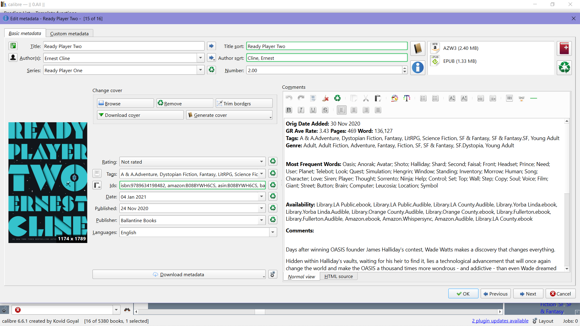 I know that it's possible to create and update the jacket through the files in Calibre, but I have never been able to really understand and figure out how to do it. Since I have a Kindle Paperwhite none of the book metadata shows and I have relied on both a Calibre Catalog and book jackets to get book info to choose what to read next. Over the years I have developed a bit of a hack to get what I want in that jacket by copying over in a nicely formatted way the various data from columns into my comments of the book. However, when I open the book and see the data it's like all my hard work has been replaced with an ugly jacket that isn't set up to handle all that data and is not editable. I know that using the comments column isn't the best idea, but it's the only idea I have at the moment since there isn't an option to use another space for this. If the comments column had the ability to format the line height that would be helpful in setting up the spacing between paragraphs. I propose a plugin that would allow someone to create a jacket along the lines of how a catalog is made, but with the option to edit the formatting of line spacing/height, font, which metadata to add, etc. Maybe allow multiple templates to be created and saved which can then be used instead of the generic one created by Calibre. There are so many different areas that could be edited. People who aren't very adept at editing the jacket template within the Calibre folder would benefit from this. I know this is a tall order and most likely not done, but if there was the possibility for a better way of getting all that data in a nice package so that I could better see what I am getting I would appreciate it. |