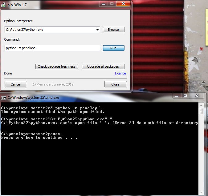 But i find the script "penelope" and run it with pip "c:\python27\script\penelope". I try to test it but i don't know where to put the dict.zip. run with pip Code: