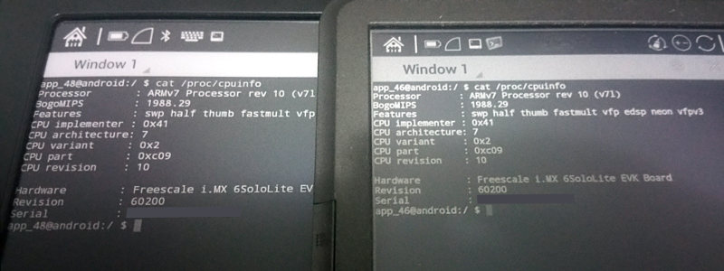 `cat /proc/cpuinfo` on a T68 and a MaxCarta: both are