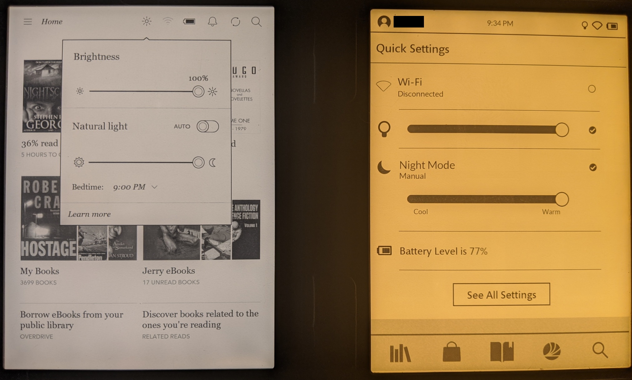 On the Nook, when using warm light settings, from 0% to about 75% the white lights are on and more and more orange is mixed in. But, once you cross about 75% warm lighting, the white LEDs fade off and then only orange LEDs are lit. A picture is worth a thousand words, so I've attached two thousand words for you. The Clara is on the left and the Glowlight 3 is on the right. Lighting is different device to device, but in one I tried to get the two as equal as I could. On the other I maxed out the Nook's warm lighting. The difference is obvious. (Sorry for the slight fisheye. My Pixel is being weird). Edit: after reading for the night, I tilted my Clara until I could see the glow from the LEDs at the bottom. At max orange, the white lights are off. So I'm not sure why the Nook has so much more range. The white lights do only seen to turn completely off when you are at our near 100% night mode though. Last edited by ZodWallop; 06-27-2020 at 01:36 AM. |