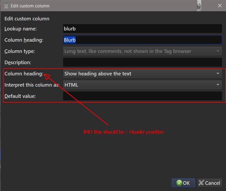 The Comments header was added to Book Details display when Long Text columns were enhanced, and I don't think there should be two fields titled "Column heading" in long text definitions. BR Last edited by BetterRed; 02-11-2022 at 06:06 AM. |