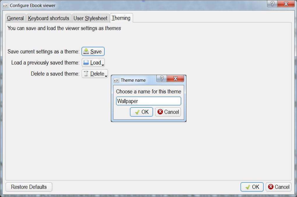 Red: 68 Green: 51 Blue: 0 Click OK Then click OK again. Your book in calibre viewer should have the same background and text color as the example you cited. If it doesn't then review the path you set in step 1 above, ensure all slashes are in the same direction as I indicated and that it does point to the file's exact location on your machine. 3. Now that the background and font color are set open preferences again and go to the Theming tab (see attached). Click the Save button and enter a title for this theme. Click OK then OK again. Now you have saved this theme and if you decide to experiment further you can always go back to this theme via the Load button. Last edited by DoctorOhh; 04-14-2013 at 03:08 AM. |