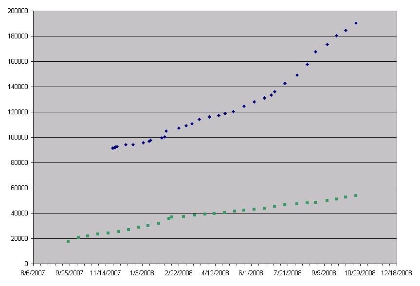 In the same period Amazon have added 5800 new titles (a 3.1% increase) and now have about 190,481 ebooks for sale for the Kindle with an average of 299 new ebooks per day added to their offerings since November. Below is a plot of the total number of ebooks available from these two vendors since I began tracking them in September of last year. |