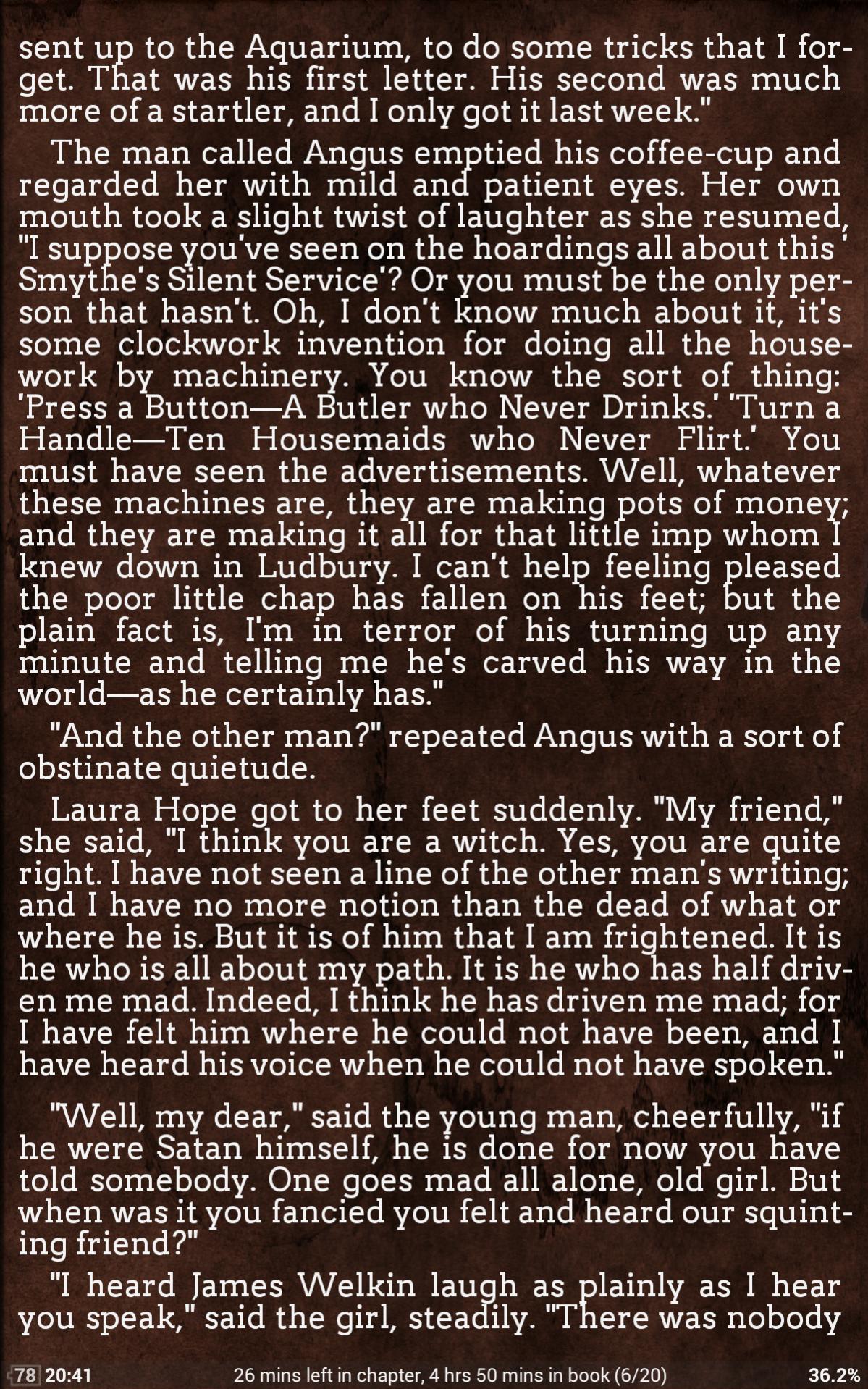Each of us is different. To each of us, a particular theme will carry different associations. By far the best real books I've read in my life have been library books with just such "dirty" pages. Most of the books I'm really interested in are out-of-print -- they simply can't be bought, looking nice and clean. Before the invention of e-books, I spent many fruitless, frustrating years trying to hunt down this or that impossible-to-get book. And when I finally did get it, usually via inter-library loan, and which may have taken a few years for a particular title, the book typically arrived with this "dirty, greasy" look. And I was ecstatic -- it was an occasion to celebrate. And so, you see, to me, the association I have for a "nice, clean look", is: worthless, trashy book. But if it has a "dirty", smudged-all-over look? Oh boy, that must be some quality literature! ![]() I now avoid printed books whenever I can. But seeing that "dirty, greasy" look in Moon+ Pro gives me a sense of triumph every time, reminding me of that pleasurable sensation of a long time ago, "The book's finally here and I can read it!" |