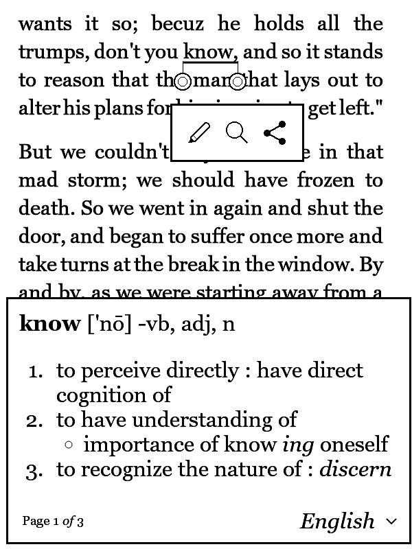 Different to previous packages, this package contains batch files specific to device models. For instance, if you want to patch for Aura HD, double click 3.18.0_aurahd_h2o.bat, and find the created KoboRoot.tgz in 3.18.0_target_aurahd_h2o. As for the values of the inline dictionary view, I tried to find nice values for Touch and Glo (they should also be acceptable for Aura). As for the other models you would have to find yourself proper values. If you can, please post them here. The concerned patches are those with position=B996F4 and position=B99E84 in libnickel.so.1.0.0.txt, and position=4B607C in nickel.txt. For reference, I uploaded screen shots of the dictionary showing the entry for "know". Pay attention that the whole text is visible (not cut on the right border or at the bottom), and that all numbers in the numbered lists are displayed. Last edited by tshering; 09-27-2015 at 08:26 PM. |