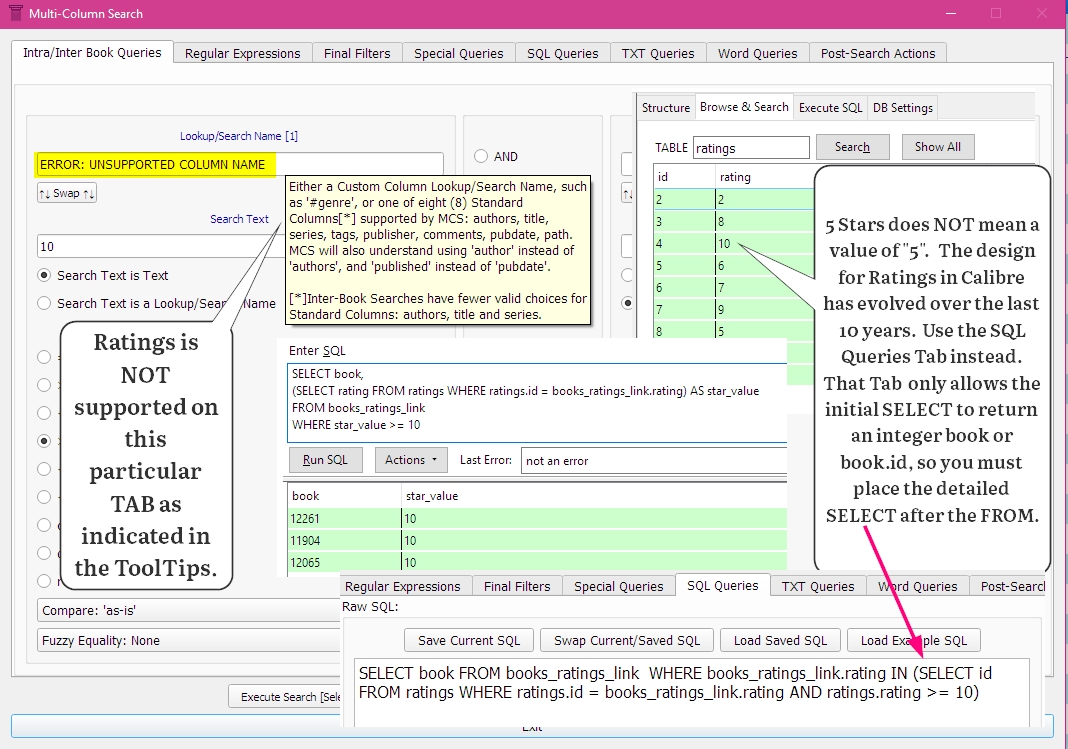 The tooltip did not help as I use rating with a custom column. Also that my column is offered in the drop down. Anyhow I got what I like with the SQL tab. For those who like to copy and paste please find here my sql. Replace "18" with the proper number of your customn column as shown in the tooltip on your screen. SELECT book FROM books_custom_column_18_link WHERE value IN (SELECT id FROM custom_column_18 WHERE value >=10 ) |