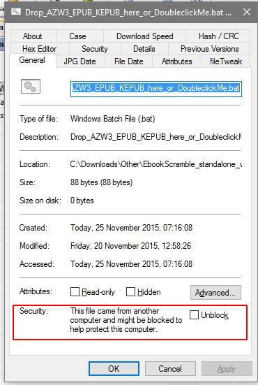 In Win 7 the messages were a bit more obscure and tended to get confused with Permission faults. If you had UAC off you didn't see them, in Win 8/10 they've separated the 'check' into a feature called Smartscreen that you can disable separately. Yes, once you click Run Anyway you wont see it again on that BAT file. All it actually does is to tick the unblock box : I think you need security certs to make it 'safe'. You might want to write something in the 'blurb' about it Quote: