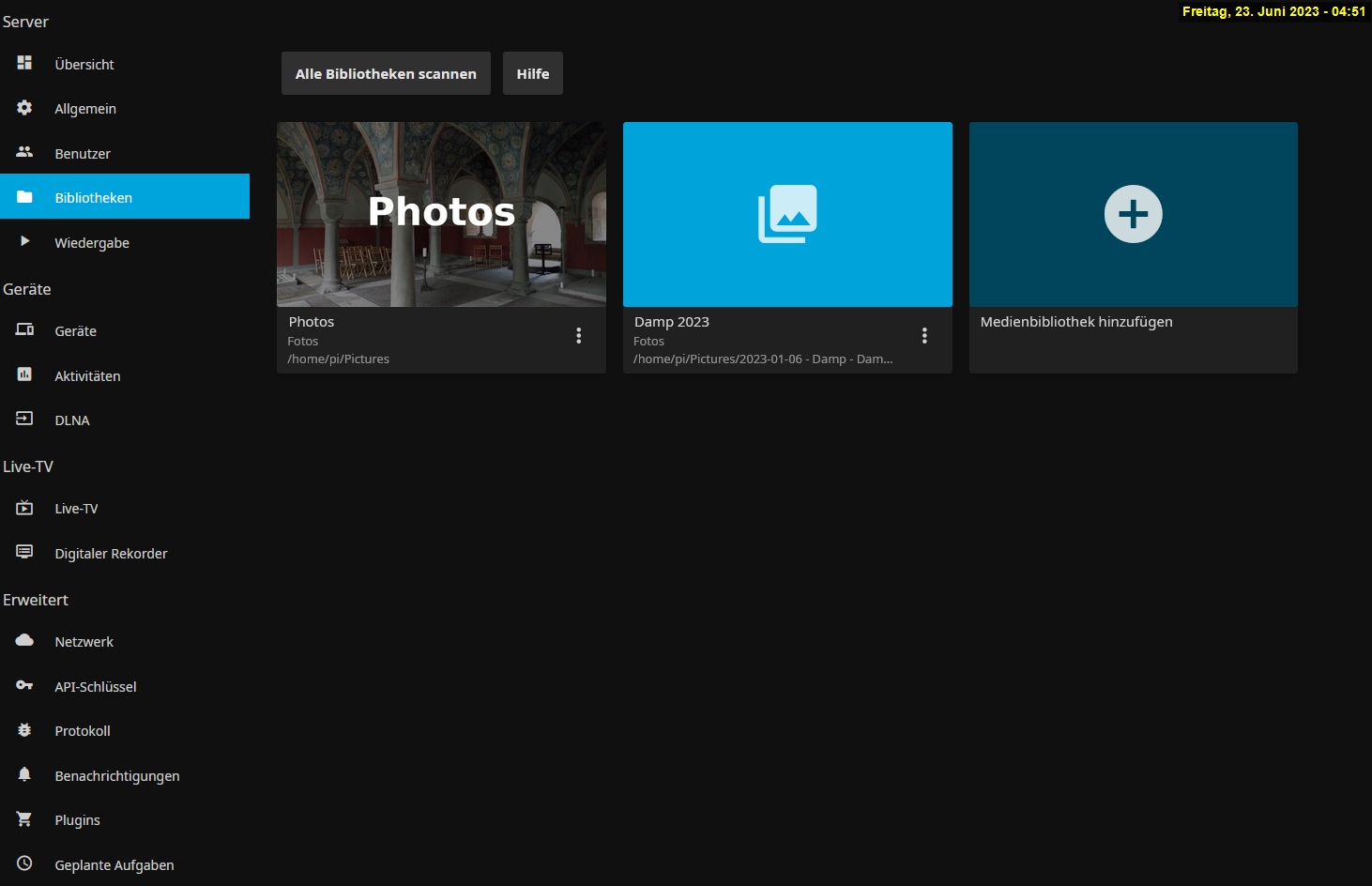 correct: freefilesync runs on a pc and has - amongst other - entries via sftp to the PIs ------------------------------------------------------------------------------------- I was curious and, on the PI3B, I installed jellyfine. There is a rather good description with all steps I followed (except the way how to make use of a static ip). Finally I have access via my ip address, created myself as user and gave info to the directory of my photos. So far, so good.. So far, so bad: On the PI 3B jellyfine is as slow as described in the net, 14,000 photos seem to be a hell of work to do a good job; but: just for trial purposes it is ok. I additionally created guest accounts, just to see, how to share files and/or folders with them. Question: would jellyfine work much better on the PI 4B (it should as it is described in forums) and is that really the solution for my intention?! Because: I'm able eg to share a specific folder with eg 12 photos with friend "A" or friend "B" (they have exclusively access to this folder), but cannot download the folder in total but only by viewing and downloading all 12 single files - that cannot be correct, or?... And: Within the menu "library" it shows 1) the path to the directory of all 14,000 photos and 2) the folder, I like to share with friend "A" or "B", resp, too - is it really necessary to pick out each folder that's for share additionally to the menu "library" instead of picking it out of the library's directory hope, the last question does not confuse too much, hence, a pic attached Last edited by huber70; 06-22-2023 at 11:59 PM. |