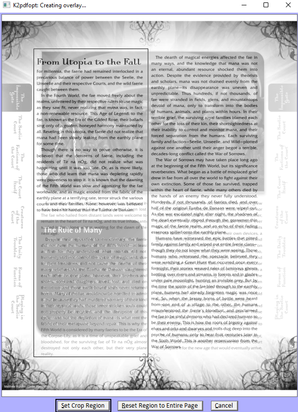 it has the vines on top and bottom. 2 columns "left" pages have a sort of table of contents on the left "right" pages have a sort of table of contents on the right I'm trying to convert it into a document that: doesn't include any large pictures like the one included on one of the sample pages converts both columns into one column I can read left to right. removes the vines removes the TOC on the left and right pages. the end goal is a book I can read much easier from a tablet or from a text to speech program. currently, text to speech programs read the left column first, then the right column of the next page, then the left column of that page, and so on, and it makes it very hard to understand what's going on when reading it in a sort of backwards order. when you look at the sample you'll understand how much of a nightmare this document is. Last edited by srpgreader; 06-15-2022 at 01:43 AM. |
