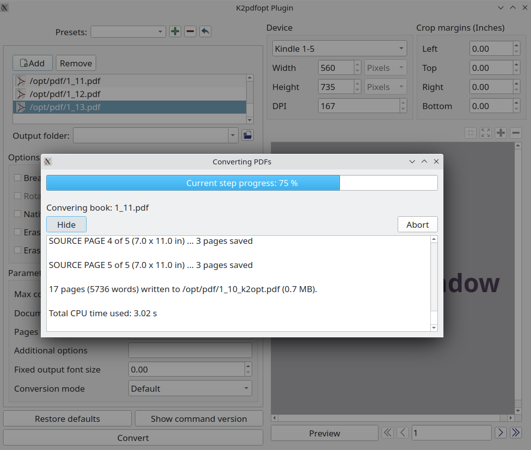 I'm going through the options in k2pdfopt in order to read PDFs on a 6" e-reader, and have a few questions: 1. Are "Native PDF output" and "Re-flow text" related? I notice they are mutually exclusive, and sometimes are only available in certain modes 2. Under the hood, what is "reflow text", really? Does it mean that k2pdfopt will move text blocks leftward + downward, combine them into a single page before turning it from native PDF to a bitmap? 3. Would I have more chance converting a PDF into EPUB if I first run it through k2optpdf before opening its simplified output into Calibre and export as EPUB? Thank you. -- Edit: For some reason, -title "Some title" → "Some title.pdf" Code: