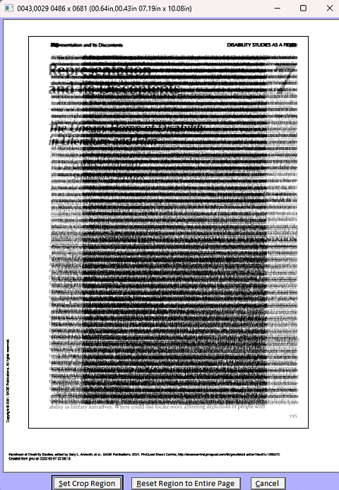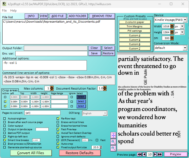 Conversion #1 See k2pdfopt_window.png and cropregion_window.png attachments. Here I tried to stay as close to your options as possible 1. I selected a crop region to ignore the edges of the page. 2. I selected "Erase horizontal lines" to ignore the divider lines on some of the pages. 3. I de-selected auto-crop. That's really meant to be for poorly scanned books that have photocopying artifacts at the edges of the pages. It doesn't work very well. 4. I set max columns to 1 just so k2pdfopt would not look for multiple columns 5. I put -fc- in the additional options box to suppress a warning message. It's also important that "Autostraighten" is selected. I set the font size to 18 points. I attached sample output to output_sample_18ptfont.pdf. The conversion was also pretty slow--200 s on my PC. See below for how I remedied that. Conversion #2 (k2pdfopt_window_faster.png and output_sample_faster.pdf) Here I made some changes to make the conversion faster and the output file smaller. Rather than setting the output font size, which is slow for a number of reasons (part of it that k2pdfopt has to analyze the file to determine the font size), I just tell k2pdfopt that your kindle window size is much smaller than it actually is. It seems strange, but this has the same effect, and k2pdfopt processes everything at a lower dpi, so it goes much faster and makes a smaller output file. Also, I set the input dpi to 300 dpi since that is the native resolution of the source file. Normally it defaults to twice the output dpi. Finally, I added "-rt 0" so k2pdfopt does not waste time verifying the orientation of the source file. This brought the conversion time down from 200 s to 45 s on my PC. The output file size is ~11 MB. Conversion #3 (k2pdfopt_window_fastest_and_smallest.png and output_sample_fastest_and_smallest.pdf) I added -bpc 1 to the additional options since the source document is just a monochrome (1-bit) document. This gets the output down to ~7 MB from an original size of ~20 MB in conversion #1. Last edited by willus; 08-11-2024 at 10:00 AM. |