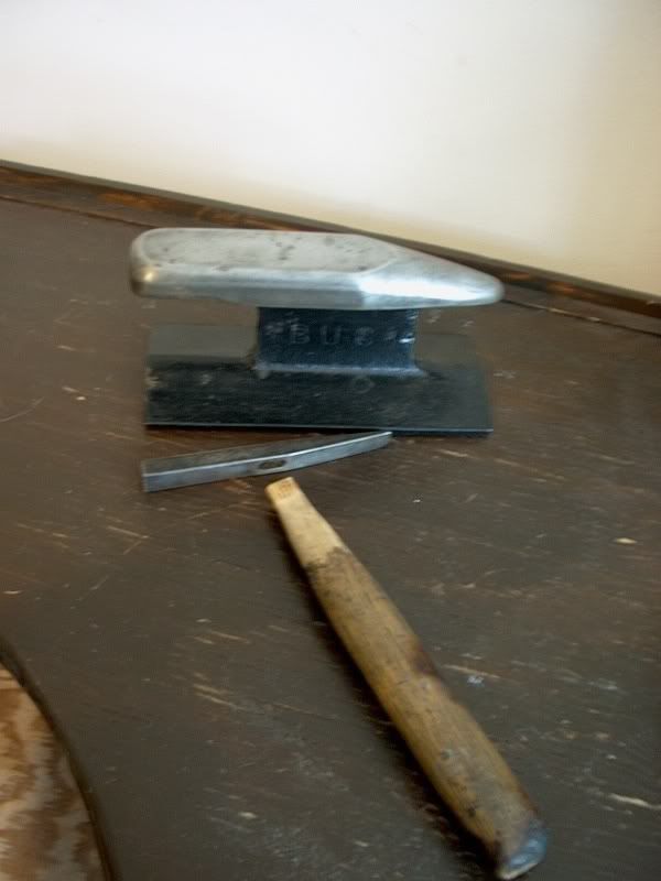 ('course, my anvil is not a 'regulation' blacksmith's anvil. It's a 8" section of railroad rail, that works perfectly for a hobbyist's anvil! Most large homecenter/DIY shops sell them these days. Looks like this.) Stitchawl |