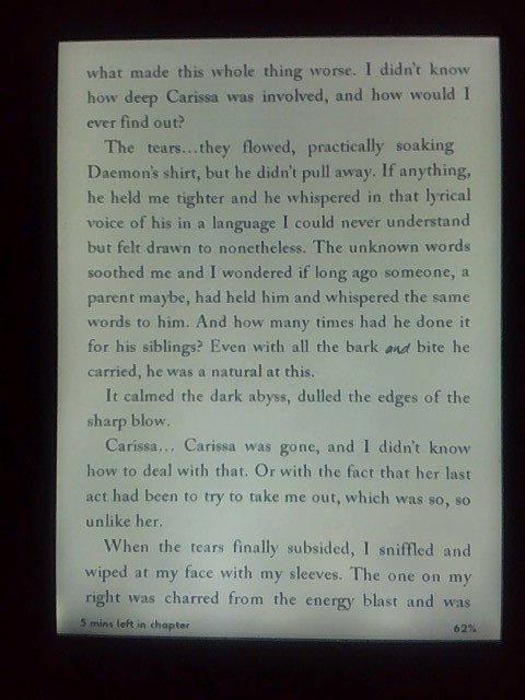 As for the glowing speck, I had one on an earlier PW that drove me nuts. That one went back. It was right in the line of text so I always saw it when reading. These two are very small (the pic makes them look bigger) and they never fall in line with the text so I never see them. I really only see them on the home screen when the book in the far right corner has a dark cover. I would notice them sometimes when I turned a page, but I haven't lately. Should the PW that arrives tomorrow be worse somehow, I'd be ok keeping my current one. Overall the screen is really nice on it. |