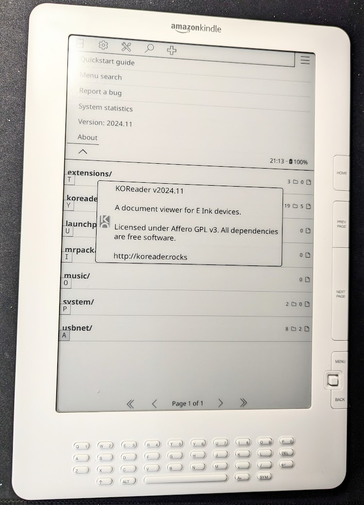 I`m running Kindle DX 2.5.8 JB, MKK, KUAL, KoReader all works great ( updated date yaaay ) but when exiting KUAL I have to reinstall MKK again for some reason. after exiting KUAL 2024.11 ( legacy ) the TEST KINDLE INSTALLATION RESULT document appears and MKK devCert must be installed again to be able to enter KUAL just to add this device is not and has not been and will not be registered in the meantime followed this guide to register device ( registration worked ! ) https://www.mobileread.com/forums/sh...ad.php?t=87336 registering device fixed the issue Last edited by vendo232; 12-18-2024 at 11:53 PM. |