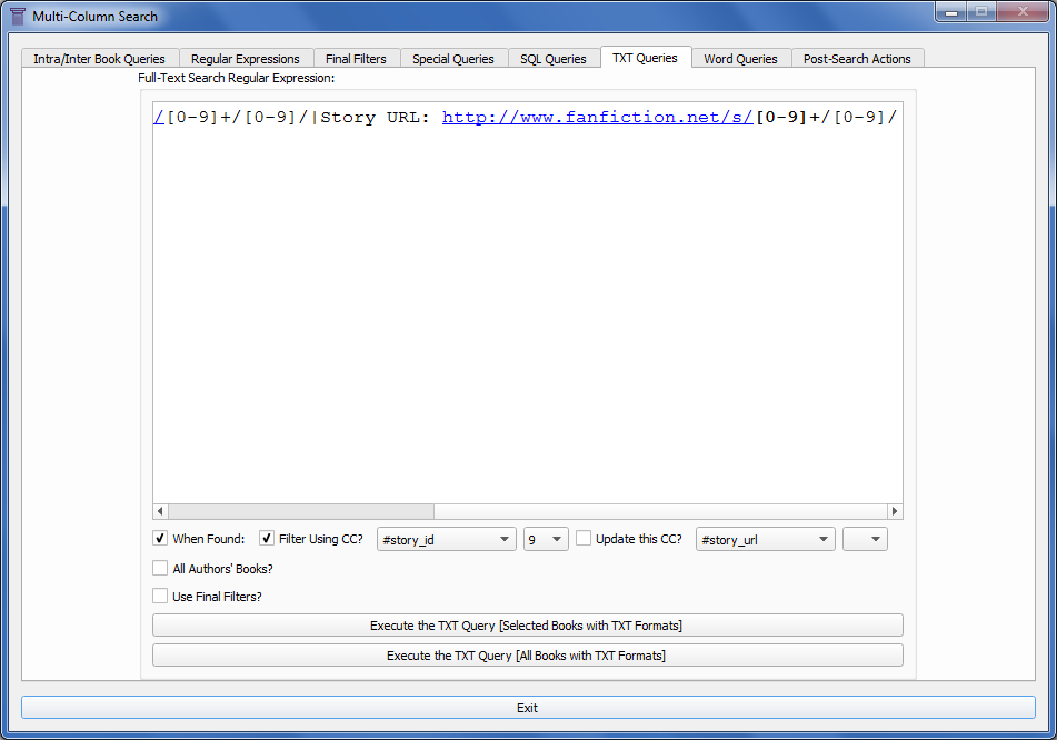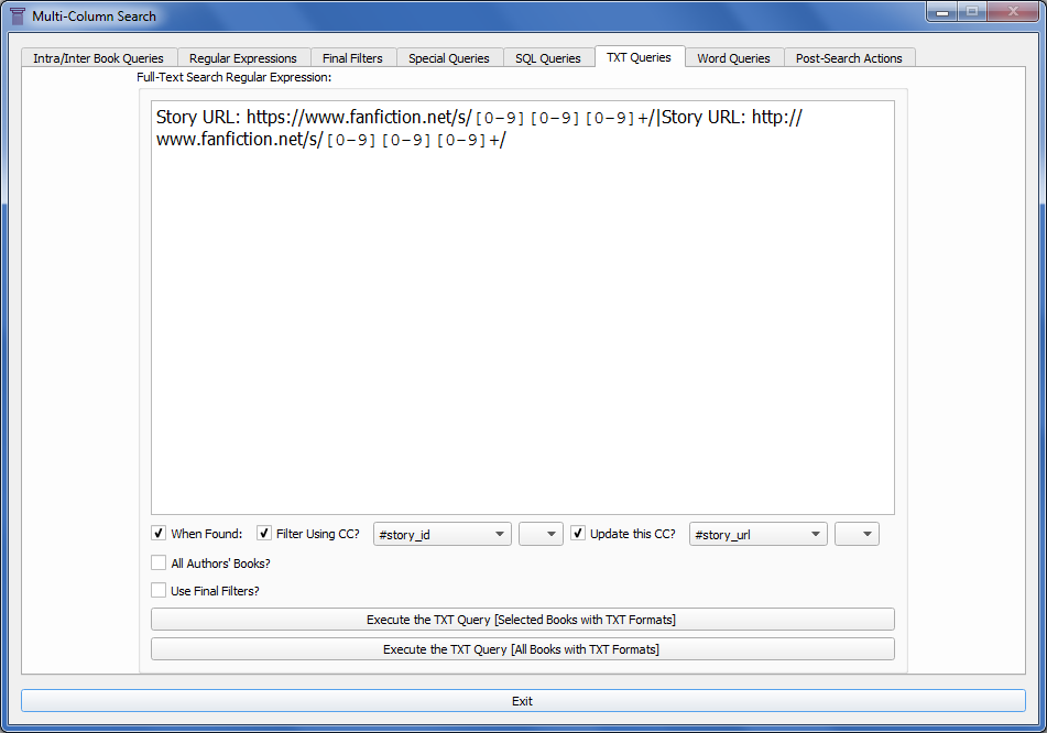 Option to additionally compare the initial search results to the value in a specified Custom Column (i.e., filter them), optionally using a Regular Expression to more precisely filter the initial search results text. Another new option to update a Custom Column using the initial search results after (optionally) further refining the search results text to be updated by using a Regular expression. These 2 options may be used separately or simultaneously. Refer to the ToolTips in the MCS Full-Text Query Tab. See the attached set of images for a Fan Fiction example having more detailed explanations. DaltonST |