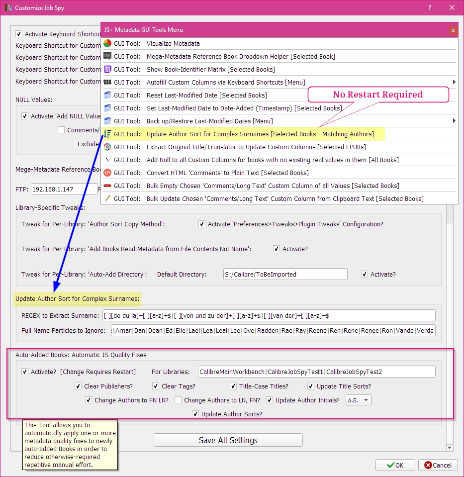 Version 1.0.104 -2018-03-13 New GUI Tool: Automatically Perform Various Quality-Check Plug-in Type Fixes after each 'Auto-Add Books' event. Also, default values improved for GUI Tool 'Update Author Sort for Complex Surnames', and that Tool now only updates Selected Books (not All Books). No restart is required as well.