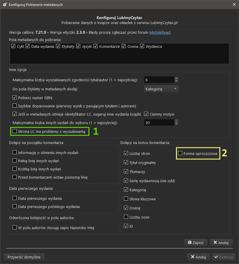 Ponieważ ponownie zaczęło działać domyślne wyszukiwanie – postanowiłam dodać nową opcję w konfiguracji, aby przy następnym „popsuciu” wyszukiwarki w serwisie LC użytkownicy mogli sobie zaznaczyć checkbox „Strona LC ma problemy z wyszukiwarką”, a wtyczka powinna sobie radzić. Zaznaczyłam tę opcję jako (1). Zwykle powinna być wyłączona. Dodatkowo dodałam dodatkowy checkbox dla tych, którzy preferują łatwiejsze parsowanie liczby stron w książce. Domyślnie liczba stron dodawana jest do komentarza w formie: Książka ma 123 strony. Jeśli użytkownik zaznaczy opcję „Forma uproszczona” zapis ten będzie wyglądał tak: Liczba stron w książce: 123 Zaznaczyłam tę opcję jako (2). |