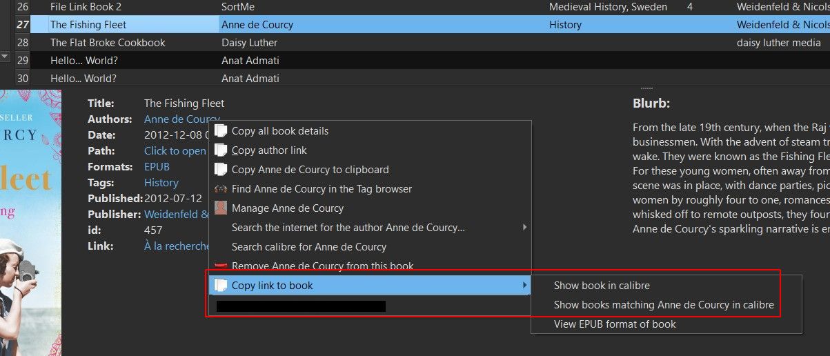 calibre://show-book/_hex_-54657374/457 calibre://search/_hex_-54657374?eq=617574686f72733a223d416e6e6520646520436f7572637922 But I've done what I needed to do for the 1800+ authors I have by switching back and forth between my content and Authors libraries, it wasn't as tedious as I had anticipated. So if adding the extra items to CalibreSpy's context menu presents a challenge I won't be bothered too much. Stay Safe - BR Aside: Rather maintaining the MHT files in Word I am moving the content into calibre custom columns - now that is tedious. PS: if you can think of a way to add a "Link" field to the other "Manageable" column types without major database surgery that would be no bad thing