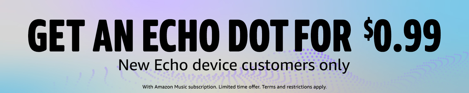 GET AN ECHO DOT FOR $0.99 -- new Echo device customers only With Amazon Music subscription. Limited time offer. Terms and restrictions apply. Quote: