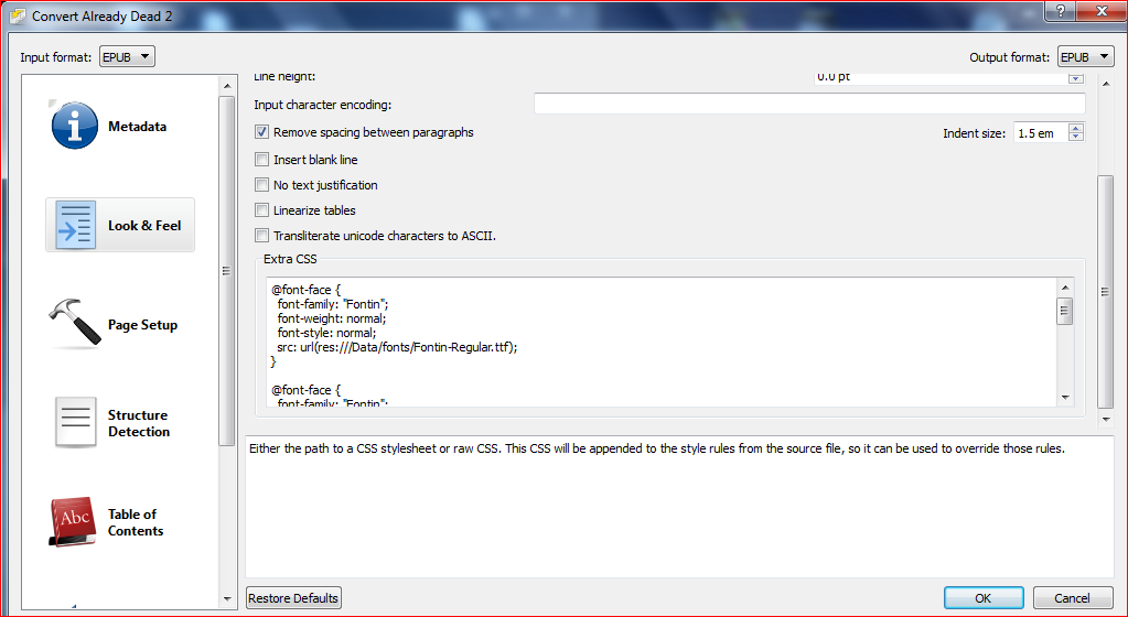 Yeah, it's modifying the code where I run into problems. I have books that don't use the new font when I convert them in Calibre, whether I look at them on my Reader, Sigil, or Calibre's internal viewer. I use Sigil to edit the code by replacing any font-family reference I find with "Fontin," which causes the font to be used in Sigil and Calibre's internal viewer. But when I put the book on my Reader, it doesn't use Fontin for some reason.