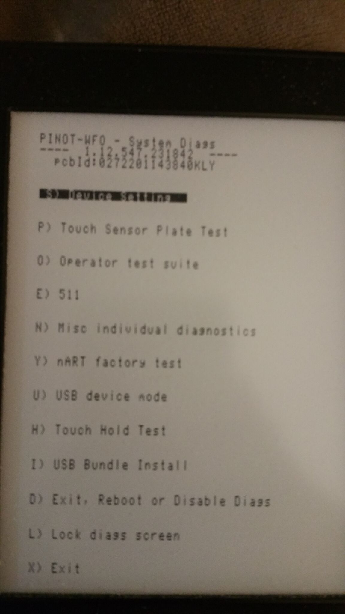 'U' - Export USB connect USB cable, Kindle to PC delete any 'ENABLE_DIAGS' file(s) safely remove (or eject) disconnect USB cable Follow the 'Disable Diags', and 'Reboot' path (I think there is another menu after making that selection. Post your results. |
