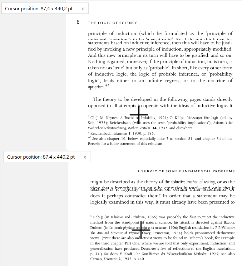 k2pdfopt.exe -o test.header.pdf -p 13-20 -mt 47p -mode fw -ls- -om 0.2 -w 758 -h 1024 -dpi 213 -fc- input.pdf -- Edit: And since footnotes obviously have a different height depending on the amount of text, I can't simply grab that section and move footnotes like Abbyy tries to do — sometimes successfully, sometimes not; Regardless, it moves them at the end of the chapter while I'd rather keep them in the page, for easier reading. Does a PDF wizard know if it's possible to 1) search for all paragraphs that start with a exponented/superscript number and 2) cut those and paste them at the bottom of the page? Last edited by Shohreh; 09-15-2025 at 07:54 AM. |