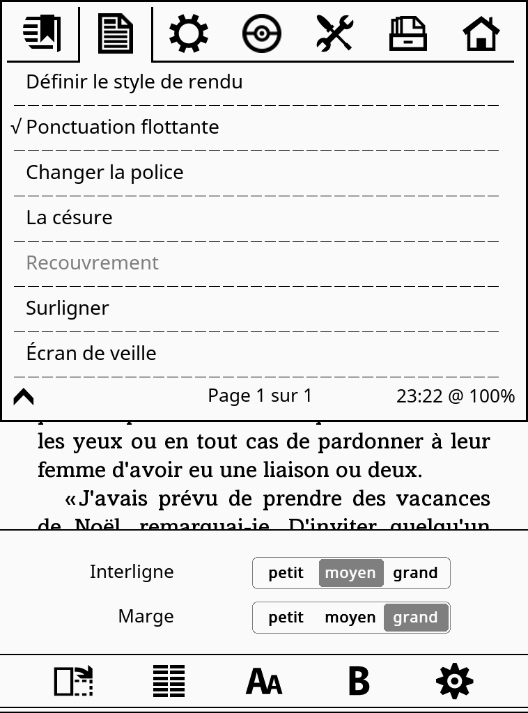Tried Koreader after two database crash but was overwhelmed with the options. My epub were more snappier than ever but all the style were gone. Plus I got a large screen (Aura H2O) but like huge marges as I dislike to read long lines (I keep the large screen to read manga). Two questions : how can I make the Koreader use the style included inside the epub ? and it is possible to make marges more bigger as the bigger option is still to small for me (on Nickel, I use it at max value without patch). |