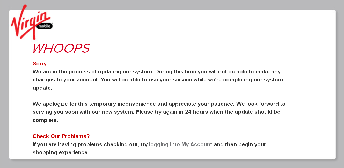 Much more often than not in the last couple of weeks I've seen this sign when I've tried to sign into my account at Virgin Mobile. That's a long 24 hours. I wonder what gives?