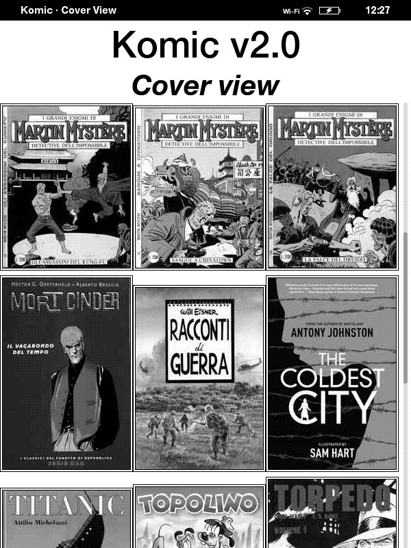This is an alternative for the dropdown menu, so tap on a cover to open the comic. I'm thinking about adding a middle step: tap on a cover to zoom it then tap again to open or tap on the background to return to cover view. ![]() Covers are automatically made when running Komic using ImageMagick command line. They are autoscaled keeping the size ratio and then lightened to avoid ultra-slow scrolling in cover view. All this takes a while (actually ~1 min for about 20 covers) but I wrote the script to create covers only for newly added folders. In the meanwhile, here are screenshots: |