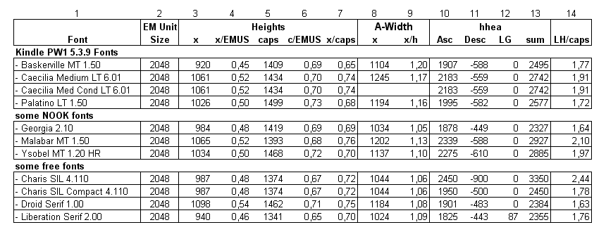thank you for your kind words @Barty glad it worked for you Now I've done a small table of Kindle's/NOOK's and some free serif fonts which may be helpful in "adapting" font's line-heights for use on the Kindle. Let me explain the columns: 1 - Font: as found on device or as distributed (for private use the NOOK fonts can be extracted from software update files I think) 2 - EM Unit Size: in all cases 2048 but could be 1000, all other values are relative to the unit size 3 - x-Height: height of the x glyph (baseline to top) 4 - x/EMUS: ratio of x-height to unit size (0.45 means the x-glyph's height uses 45% of EM) 5 - caps-Height: height of (latin) caps glyphs (baseline to top) 6 - c/EMUS: ratio of caps-height to unit size (0.69 means the latin caps glyph's height uses 69% of EM) 7 - x/caps: ratio of x-height to caps-height (0.65 means x glyph has a height of 65% relative to caps-height) 8 - x-AdvanceWidth: Advance Width of x-glyph (incl side bearings) 9 - x/h: ratio of x-AW to x-height (1.20 means x glyph has an advance width of 120% realtive to x-height) 10 - Asc: hhea Ascender (height from baseline to top of font bounding box) 11 - Desc: hhea Descender (height from baseline downto bottom of font bounding box - always negative) 12 - LG: additional Line-Gap 13 - sum: Line-Height=Asc-Desc+LG 14 - LH/caps: ratio of Line-Height to caps-height (1.77 means Line-Height is 177% relative to caps-height) (all values are for regular font, except Caecilia Medium which is used as Regular by Kindle) I'm sure you will know what to do with all this information ![]() but here some thoughts anyway - Baskerville may have not been the best choice for the Kindle as it has a relative small x/h (Column 9) ratio; or: Baskerville is a wide font - Caecilia Cond isn't a designed font, the Kindle software does the "condensing", I think Caecilia Cond could have a x/h ratio (Column 9) of around 1 - the NOOK fonts listed work for me "out of the box" for the Kindle except I like a little more Line-Height for Georgia and a little less for Ysobel; in case of Ysobel I use the hhea values of Caecialia and have a good readable page - the free fonts are all nice but need some "heavy" tuning to work on the Kindle I think; Charis has a very large line-height (the Compact version adresses this issue); Droid has very tight lines and Liberation (aka Chrome Tinos / same metrics as Times New Roman) is relatively small. For me the main problem with the free fonts is their stroke width being "too" fine for use on an ereader device. I do not need the fonts as "fat" as Caecilia, I am happy with the listed versions of Palatino, Ysobel and Georgia (as designed afaik with etext applications in mind). And this is me being 50+. So - as I said in my earlier post - give the original metric of the fonts a chance. |