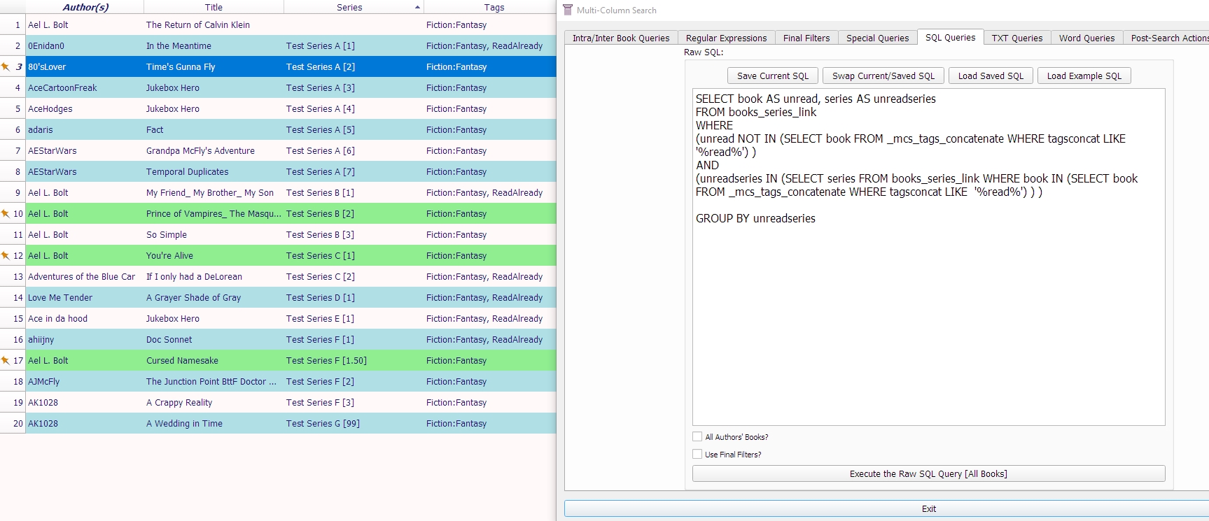 "LIKE" ignores the case of the letters, but uses both _ and % as a wildcard. "_read" starts with an underscore, so as to avoid complications in my testing, I used "ReadAlready" instead. Finally, table _mcs_tags_concatenate is an MCS Search Accelerator Table is automatically updated by MCS in most cases. However, if you make a lot of Tag changes and immediately want to run this MCS query, it might be a good idea to force a manual update of the MCS Search Accelerator Tables via the menu path MCS > Refresh MCS Search Accelerators. There are search accelerator tables for both Tags and Authors. The menu ToolTips mention Authors, but the same is true for Tags. DaltonST |