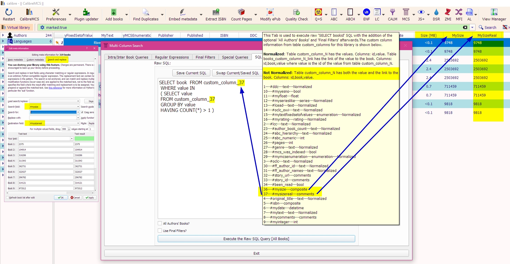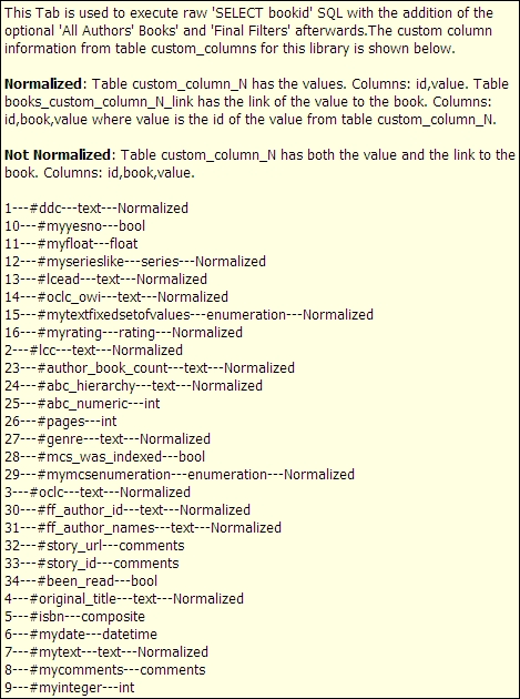 You are using the SQL Query Tab. The "9" in that Custom Column table number has nothing whatsoever to do with anything else. It is a coincidence that the Regular Expression Tab regular expression that you used in the Full Text Query Tab was a "9". See the attached picture of the ToolTips for my SQL Query Tab. The numbers on the left are the Custom Column table numbers. They are Calibre-Library specific. Your numbers will be different than mine, and even different among your own Libraries (unless they are copies of each other). The SQL Query Tab can use regular expressions, but only as part of the SQL that you write. The "example SQL" button in that Tab has a lot of examples, including one with the REGEXP operator (I wrote just for MCS, by the way; it is not standard SQL that comes with Calibre). Code: