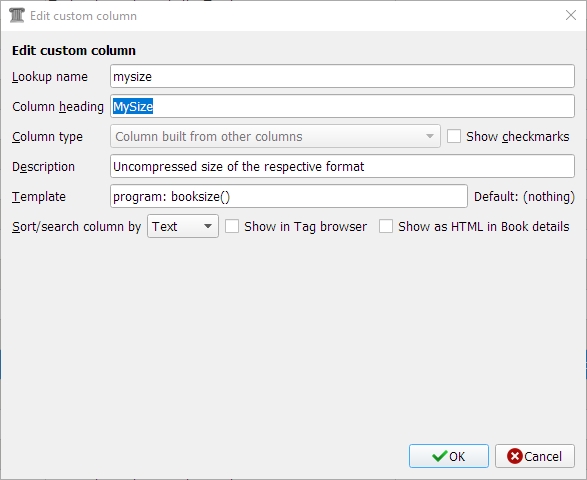 However, it has indirect support for "size" if you do this: [1] Create a Composite Custom Column that looks like the one shown in the attached image. [2] Use that Custom Column as you would any other Custom Column in MCS. Note that you will see the "uncompressed size" from metadata.db table "data", and not the user-friendly "size" shown in the Library View. An example is shown in the second image. DaltonST |