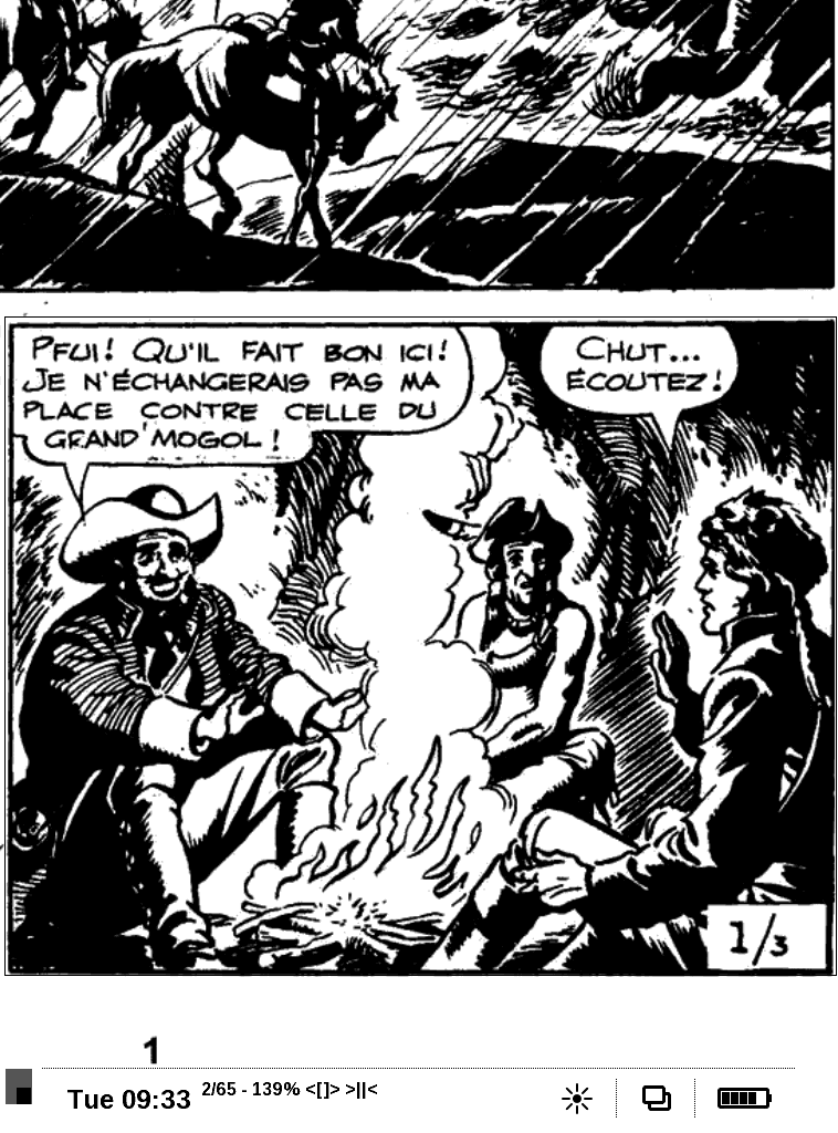 No, it's not normal. It was only happening with firmware version 5 because of the way pocketbook developers moved the status bar. rkomar has already fixed the issue but hasn't published the new fixed version yet. There are some small margins but it's not a big deal. Here are a couple of pics showing how the application looks like with the status bar and without it in the latest version (original image is 1600x1200 but I reduced it to 800x600): Yes, the text is big enough to see what's written in the text bubbles without zooming in because the screen is quite big and high resolution (1600x1200). Also, it's usually easier to read manga than normal comic books/graphic novels because manga pages tend to be smaller and text bigger, but I think both are relatively readable. |