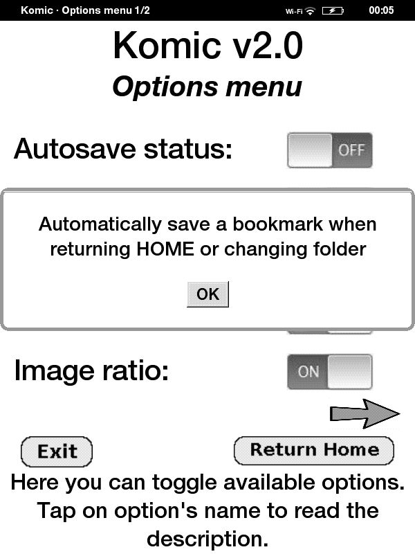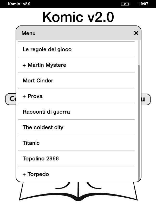 The drawback is still there, but it looks cool (IMHO!!). Anyway, next release will have also the cover view, so you can choose which to use! In the meanwhile I'm studying how to create a custom menu using Kindle's own system! Screenshots explanation: - first screenshot is taken immediatly after Komic has loaded - second screenshot is taken after having tapped on Torpedo |