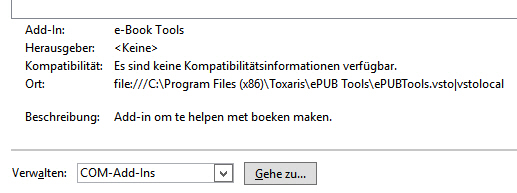 I looked into <Options/Add-ins>: Epub-Tools is registered but in a funny fashion (see attached screen shot). Any help appreciated! Klaus |