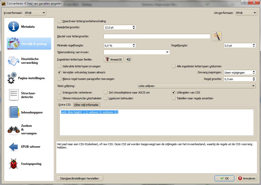 ( it is now disabled ) Basic: I use only sideloaded epubs. I don't use any other part, with the things you change the pages are filled to 7 mm of the bottom, and the page xx of xx is floating maybe 5 mm from the bottom in nice Amasis font. I use calibre for putting the Amasis font in the book ( I like it the most) and convert them so the font is inserted into the book, with an extra setting at the conversion at the part of look and behaviour, insert extra .css: body {line-height: 1.2; widows: 0; orphans: 0;} ( see picture I try to add at this message ) I use the device for what it is,reading, I only read sideloaded epubs, so do I have to enable the patch Fix page breaks bug ??? I just like to have my ebooks "clean" so every line start at the left, I don't want the text stretched so the whole line is filled... if there are only 4 words on a line it is okay with me, I have a tablet for internet and I don't play games, it is a E-Reader. So.. does the patch helps me or is it not needed because Calibre handles the Widows and Orphans ? Also here ( https://www.mobileread.com/forums/sho...&postcount=272 ) someone says that Kobo has retracted 3.5.0. ? Again: https://www.mobileread.com/forums/sho...&postcount=284 So it seems that hacking 3.5.0. was a waiste of time ?
