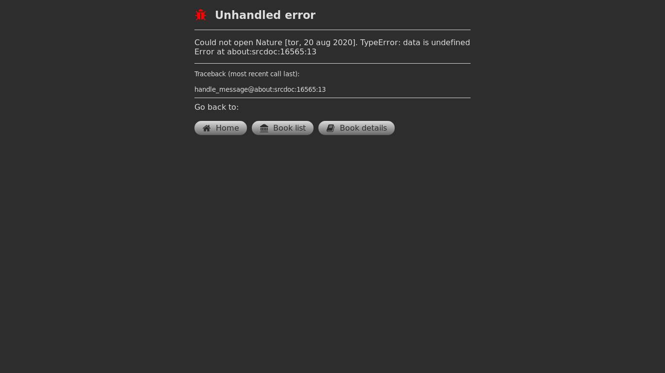 Could not open Nature [tor, 13 aug 2020]. TypeError: data is undefined Error at about:srcdoc:16565:13 Traceback (most recent call last): handle_message@about:srcdoc:16565:13 |
