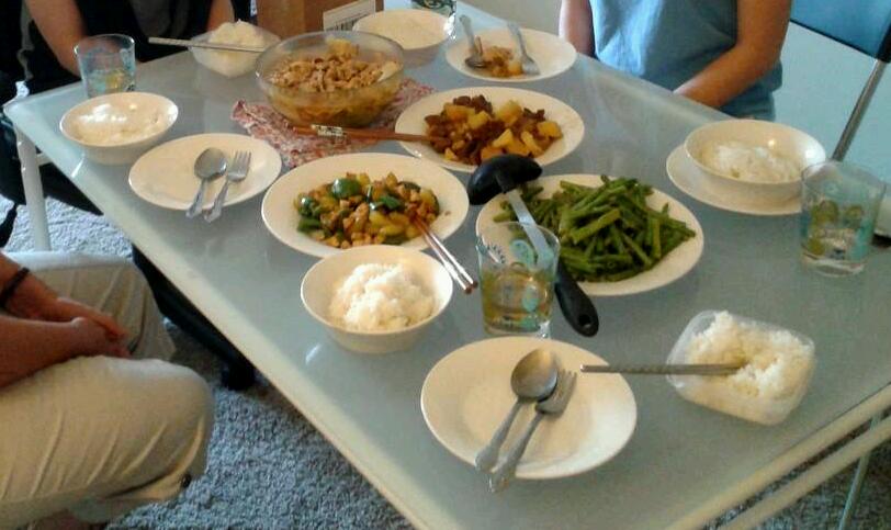 Hopefully no cat involved, lol, but a couple of the Chinese students invited me and my sister and the young couple that hosted them when they first flew in to a meal in their apartment. They have, I believe, 4 plates, 4 bowls, 2 cooking pots, a serving bowl or 2 and a rice cooker. The kitchen in this high rise student apartment is more of a nook. Both of them are more used to their mothers doing the cooking than doing it themselves. And yet they prepared this delicious meal for us: a pork dish, a chicken dish, and a beef dish. They borrowed chairs from fellow students and bummed a ride that morning to the international farmers market on the north side of town to do the shopping. I am humbled by the hospitality of these young people... |