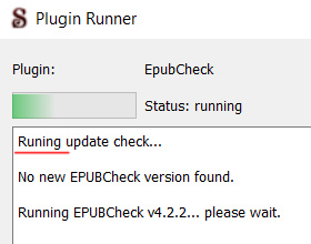 Look in your Sigil plugin directory for the EpubCheck directory. Inside that, you'll find a file called plugin.py. Around line 203 in that file, change Runing to Running. Errors in the translations are left as an exercise for others.