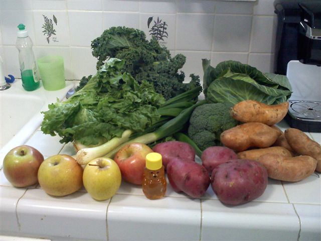I just picked up this week's vegetables. Lettuce! Broccolli! Cabbage! Raw honey!